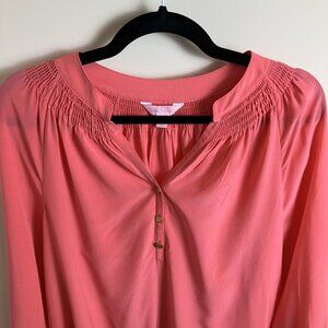 Vibrant pink blouse with button details. Long sleeves and gathered neckline. Perfect for a chic look.
