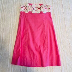 This gorgeous Bowen Dress from Lilly Pulitzer in Hotty Pink is truly one-of-a-kind. Strapless stretch cotton dress features intricate lace on the fitted bodice - Empire waist - Seamed skirt - Fully lined - Hidden back zipper - Cotton/Xlalastol - Size 6.
