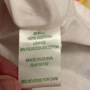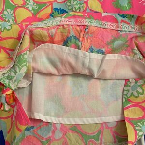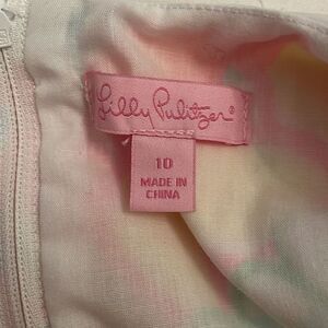Bright pink, green, yellow, blue, 100% cotton, sleeveless shift dress in the floral, Ice Cream Social pattern by Lilly Pulitzer in a girl's size 10. Rear zipper. Fully lined. Two front pockets. Round neckline with white trim. Three white, floral rosettes on front chest. Ties on each side of the dress. Machine washable. Approximate measurements shown in photos. In very good pre-owned condition.