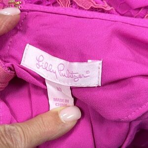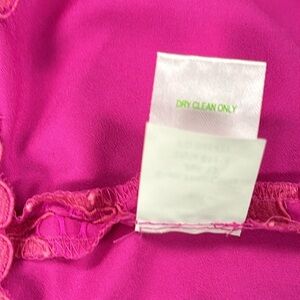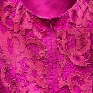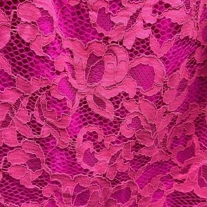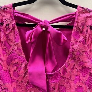 Elegant pink lace dress with bow detail. Features long sleeves and intricate floral pattern.