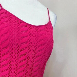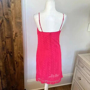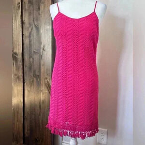 Elegant pink lace dress. Spaghetti straps. Fringe hem detail.