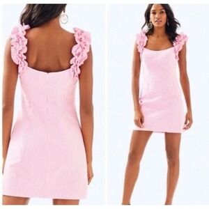Embrace playful elegance with this charming Lilly Pulitzer dress. Delicate pink and white seersucker fabric creates a classic look, while the eye-catching ruffled straps add a touch of feminine flair and unique detail. This dress is perfect for garden parties, beach vacations, or a stylish brunch.