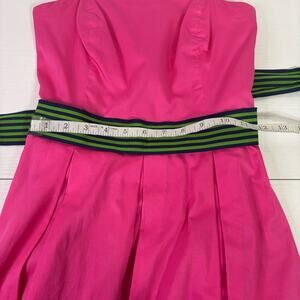 This stunning pink sundress by Lilly Pulitzer is perfect for parties or cocktail events. Featuring a strapless neckline and a sleeveless design, it boasts a vibrant pink hue complemented by a striking green ribbon at the waist. The dress's A-line silhouette and formal style make it an elegant choice for any special occasion.