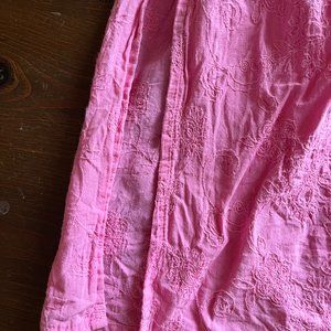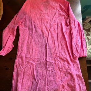 Lilly! Worn in but still in good shape. Tunic with slits on each side (small tear on one side, easy to repair), and slits at wrist. Great top for casual wear, the beach, or out to dinner. Vibrant pink, solid but embroidered with florals all over. Mandarin collar with buttons up front. Size S/M