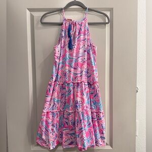 Vibrant pink and blue pattern. Sleeveless design. Perfect for casual outings.