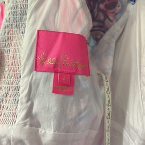The Lilly Pulitzer dress is a stunning sundress perfect for a wedding guest or cocktail occasion. It features a vibrant mix of pink and blue hues with a bold floral pattern. The dress has a square neckline and short puff sleeves, adding a romantic touch to its fitted silhouette. Its mini length and smooth fabric make it a stylish choice for any event.