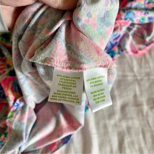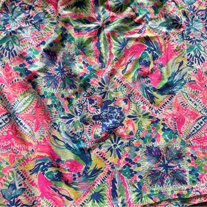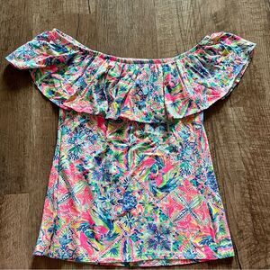 This Lilly Pulitzer blouse features a charming ruffled design and short sleeves, offering a relaxed and stylish look. The vibrant pink and blue colors create a lively and cheerful appearance, perfect for warm weather. Its flowing cut and light fabric ensure comfort and elegance, making it a great choice for resort wear.
