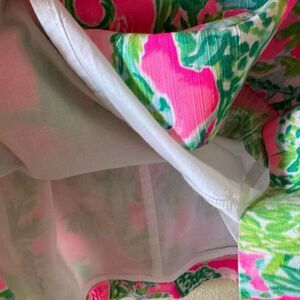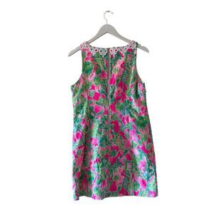 Vibrant mini dress with pink and green floral pattern. Sleeveless design with lace detailing. Perfect for a sunny day.