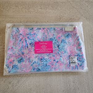 Vibrant floral pouch by Lilly Pulitzer. Features pink and blue hues. Perfect for organizing essentials.