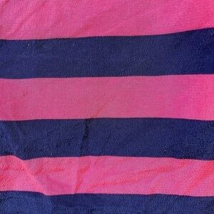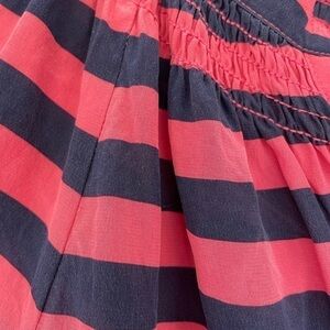 This Lilly Pulitzer silk blouse is called the Elsa. It features a navy and dark pink stripe, pullover style, and shirred neckline. It also features 3 functional gold buttons and elastic cuffs. 100% Silk, dry clean. Size Medium.