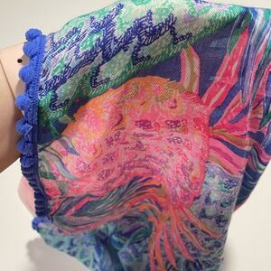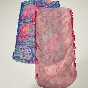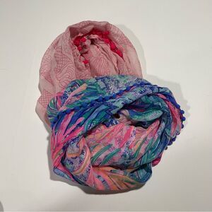 Gently worn women’s Lilly Pulitzer infinity scarves set. Blue and pink with pom pom trim. Please review all photos for any signs of wear-pictured as is. Disclaimer: Any items with any wear/staining has not been treated, and unsure of ability to remove/treat condition. Comes from a smoke free home, bundle with other items to save & minimize shipping cost.