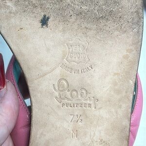Stunning and adorably sophisticated! Lilly Pulitzer Pink Kitten block Heel Sandals. Made in Italy. Super soft leather. Cute pink daisy accents. Preloved condition. A few light spots and out sole scuffing. Please refer to pics for reference of condition. Overall great find! NO BOX!