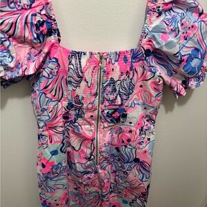 A classic Lilly Pulitzer pattern peasant dress with puff sleeves and sweetheart neckline.