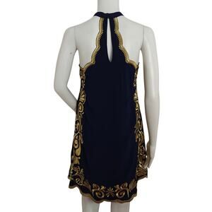 Lilly Pulitzer Quinn halter swing dress in women's size XXS. True Navy Gypset Swirl dress. Beautiful gold embroidery. Sleeveless. Hook and eye closure in back with a keyhole opening. Dress is lined. Gently pre-owned.
