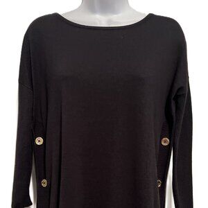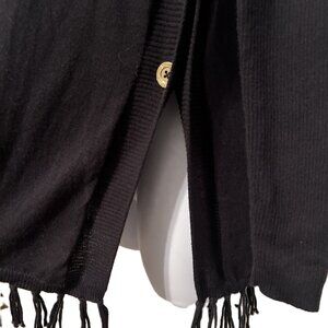 Lilly Pulitzer Ramona fringe long-sleeved sweater. This stylish black sweater features gold buttons along the sides and a fringe detail at the hem. Coolmax®: Breathable knit with Coolmax® helps you stay cool, even in hot weather. Women's size XXS Bust: 21" Length: 25"