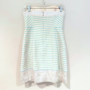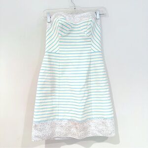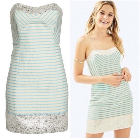 Lilly Pulitzer Remi Dress Bayview Stripe Metallic Dress Women's 0 Blue Horizon. Chic strapless dress featuring blue and white stripes with a sparkling sequin hem. Perfect for summer outings. Strapless, bodice. Dress is missing detachable straps. Made from cotton/polyester/metallic blend. Excellent, pre-owned condition. Ships from a non-smoking home. Measurements: PTP: 15" Waist: 27: Length: 27"