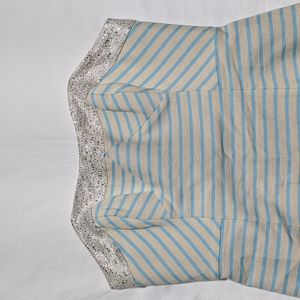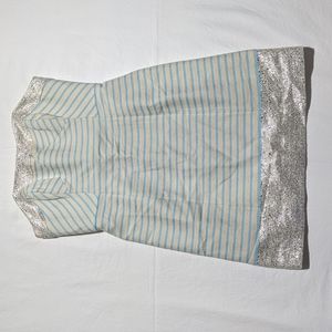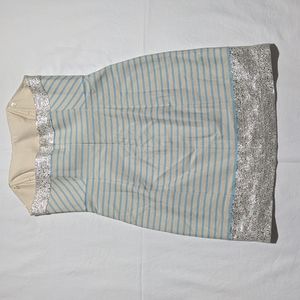 Lilly Pulitzer brand Remi Dress. Size 4. NWT, never worn, no damage. Color is called blue horizon, blue and cream stripes with silver metallic trim. Comes with two removable straps. It has a cream colored attached liner. Seams at the chest and waist for a fitted look.