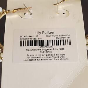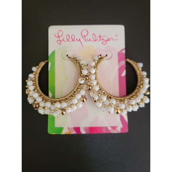 Lilly Pulitzer white hoop earrings are wrapped in gold thread with white and gold baubles. Approximately 2 inches across. New with tags.
