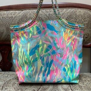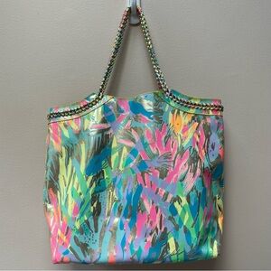 Lilly Pulitzer Reversible Seaside Beach Tote Cork Chain Top Handles Floral Print