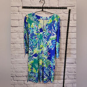 This Lilly Pulitzer Riva dress is a vibrant, tropical-print piece featuring bold shades of blue, green, and hints of pink, evoking a lively island vibe. It has a relaxed, knee-length silhouette with a slight A-line shape, offering a comfortable yet chic look. The dress includes a modest V-neckline and three-quarter length sleeves, adding a touch of elegance. The soft fabric and eye-catching pattern make it ideal for warm weather or a casual day out, embodying the signature Lilly Pulitzer resort style.