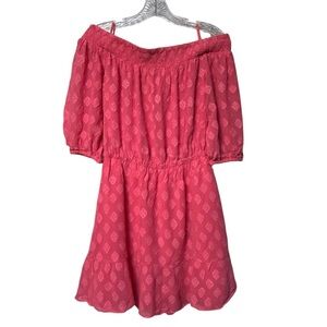 Excellent condition Chic off-shoulder dress with shorts. Features a textured pink fabric. Elastic waist for comfort. Fake wrap around bottom. Elastic on sleeve for extra comfort