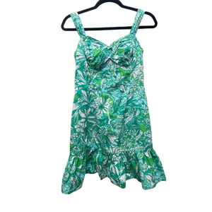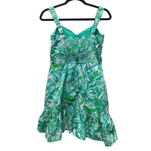 The Lilly Pulitzer Rocko Cotton Romper in the Botanical Green Safari Sangria Size 2 is a stylish and vibrant dress perfect for summer and spring occasions. This sleeveless romper features a V-neckline, zip closure, and a flattering short length. Made of cotton with a floral/leaf print in green, blue, and white, this romper is both machine washable and lined for added comfort. Ideal for parties, cocktail events, or casual outings, this Lilly Pulitzer romper embodies a fun and trendy style with a touch of floral flair.