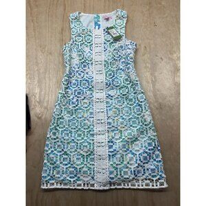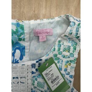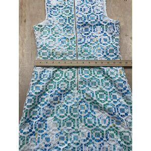 Step into timeless resort style with this stunning Lilly Pulitzer shift dress. Featuring a vibrant blue, green, and white geometric lace overlay, this sleeveless dress is perfect for spring and summer events. The structured silhouette and elegant details make it a versatile choice for brunches, weddings, parties, or vacation wear.