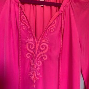 Beautiful Lilly Pulitzer Roslyn dress. Long sleeve silk tunic dress with beading around neck with silk tassels. The shell is 100% silk and the lining is 100% polyester. Dry clean only. Like new condition.