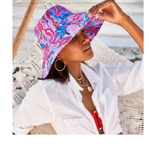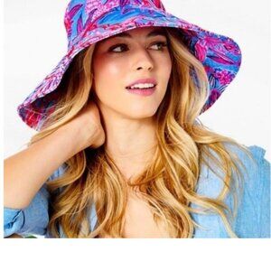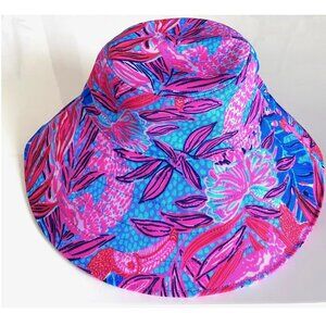 LILLY PULITZER Pink Blue Floral Print Canvas Bucket Sun Hat Beach Vacation