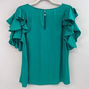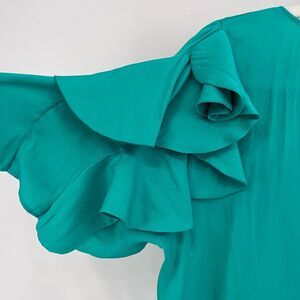 Elevate your wardrobe with this stunning Lilly Pulitzer Ana Short Sleeve Flounce Top. This satin blouse in a beautiful shade of green is perfect for any occasion, whether it's a business meeting or a day at the beach.