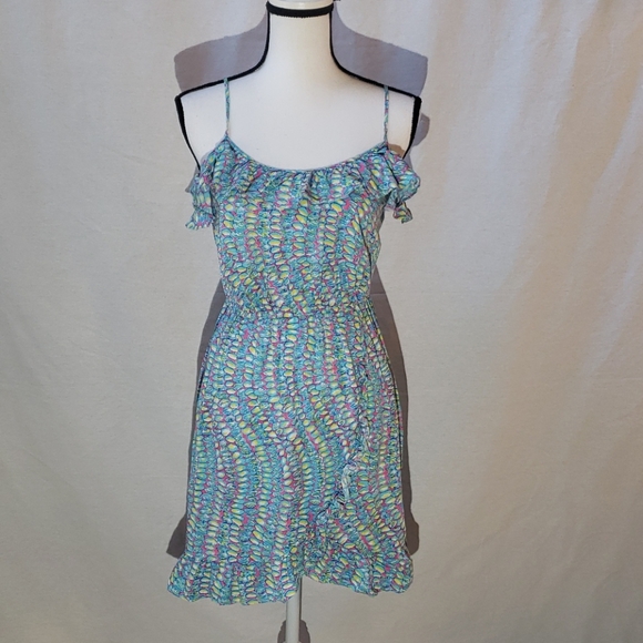 Good used condition. Pit to pit measurement shown. Approximately 31" total length ,top of shoulder to bottom with adjustable straps at shortest position. Elastic waist and chest. Color: multicolored.
