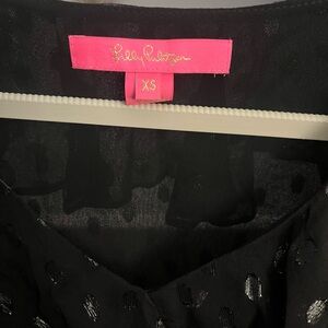This relaxed black blouse by Lilly Pulitzer features a chic ruffled design and 3/4 sleeves, offering a stylish and comfortable fit. The elegant neckline and versatile style make it a perfect choice for both casual and dressy occasions.