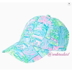 Lilly Pulitzer Run Around Hat Honda Classic NWT iconic brand name logo in gold metallic on adjustable neon pink back-strap with gold medallion detail lightweight fabric with vibrant colored Lilly Honda Classic pattern colors are pink blue green and white ( colors are brighter than shown in photographs ) never been worn