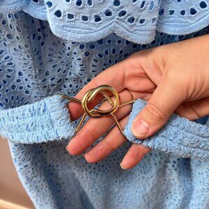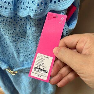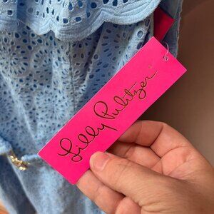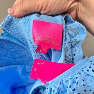 This elegant Lilly Pulitzer dress in a soft blue features intricate eyelet detailing and a ruffled neckline. The included belt accentuates the waist.