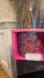 Vibrant mug with floral design. Features a bold pink initial and gold handle.