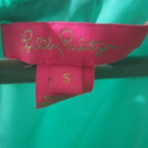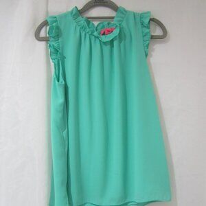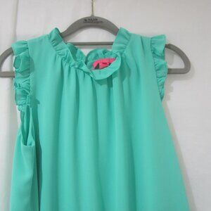 Lilly Pulitzer Shirt. Small. This is the Talisa Top, in Gustavia Green. Pull over. Back neck button closure leaving key hole opening. Sleeveless. Ruffle sleeve and neckline. Pleated neck. Lightweight and airy, lined for privacy. 100% Polyester, machine wash. Freshly laundered with no issues stains or odors, comes to you ready for immediate wear. Style 002928