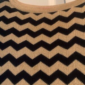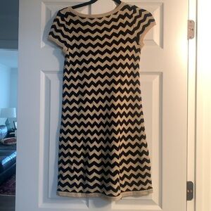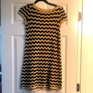 Chic and timeless, this Lilly Pulitzer sweater dress features a stylish chevron stripe pattern in navy blue and tan, with a touch of subtle sparkle. Perfect for all seasons, this mini dress is versatile for casual outings or dressed-up occasions.
