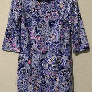 Lilly Pulitzer Saralyn Floral Blue Pink Flat French Terry Shift Tropical Resortwear Vacation Feminine Dress S