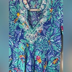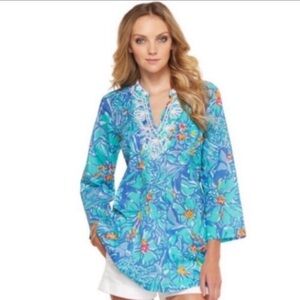 Lilly Pulitzer Sarasota Beaded Blue Iris Mai Tai Tunic Top Women’s Size XS. Neck with white beading in a shell design. Turquoise, purple, pink, yellow, white floral design. 100% Cotton. Machine washable. Made in India. Style #55351. Has a few stains on the sleeves, hard to see since it blends in with the top.