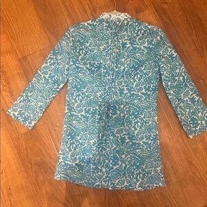 Lilly pulitzer beaded Sarasota tunic in tortuous Turquoise party favors size xs beautiful blue and white beaded blouse. Has tiniest stain on front near beading as seen in the last picture. Size of pencil point.