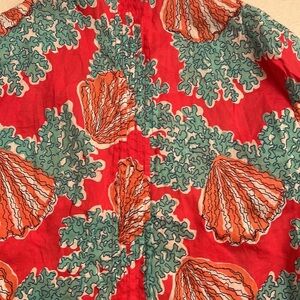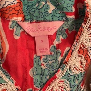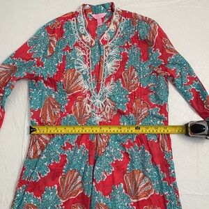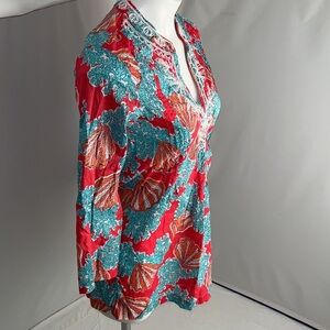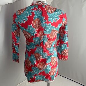 Lilly Pulitzer Sarasota Tunic in Watermelon Coralina. Split neckline on a pin tuck front and back with beaded embellishment around neckline. Three quarter sleeves. Multicolor coral, aqua and white shell print. Lightweight cotton fitted style. Excellent condition. Smoke free home.