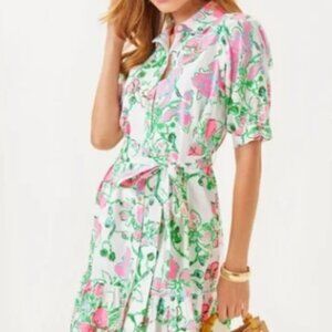 Easy fit, button front shirtdress with short sleeves, a tall hem ruffle, and a separate sash.