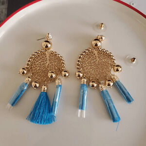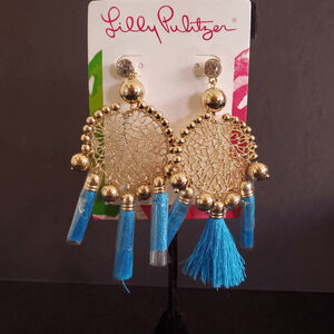 Lilly Pulitzer earrings have a gold tone web with blue fringe hanging from a Jeweled stud. New with tags.