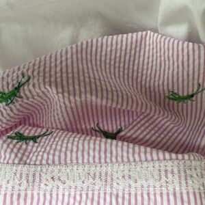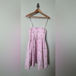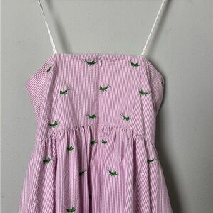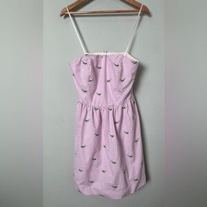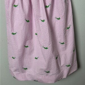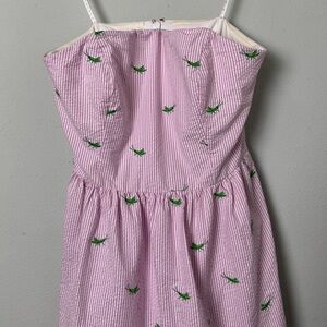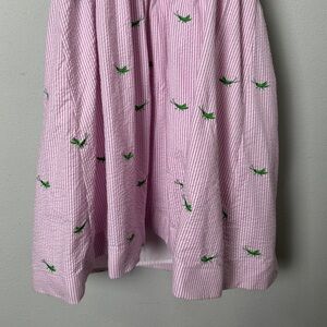 Lilly Pulitzer Pink White Seersucker Hyacint Strapless Lottie Dress in Party Hopper Embroidery Whimsical Twee Size 10