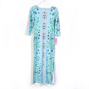 Keywords: Lilly Pulitzer, Seralina, Maxi Dress, Frenchie Blue, Mosaic Shells, Engineer Print, UPF 50+, XS, Extra Small, Long Dress, Boat Neck, 3/4 Sleeve, Side Slit, Resort, Vacation