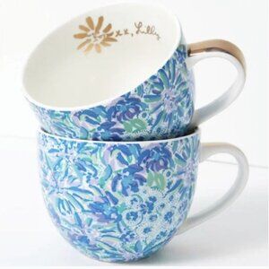 Lilly Pulitzer Set of (2) 12 Ounce Blue Ceramic Coffee Tea Mug Gold Handle NWOT