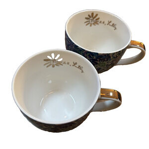 Lilly Pulitzer Set of 2 Ceramic 12 oz Coffee Tea Cups Blue Floral Lion Gold Trim