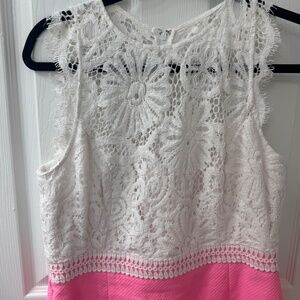 Feminine, fun, and unmistakably Lilly! This gorgeous Lilly Pulitzer sleeveless dress features a white floral lace overlay bodice and a vibrant solid pink skirt. The intricate lace texture and waistline crochet trim create an elegant contrast, while the bright pink skirt adds that signature pop of color.