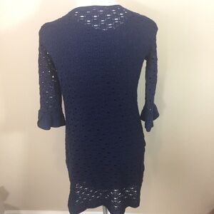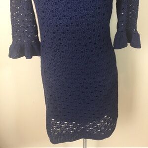 Boat neck Crochet Dress with ruffle trim sleeves. Removable tank dress underneath. Excellent used condition. Length 36” bust 21”.