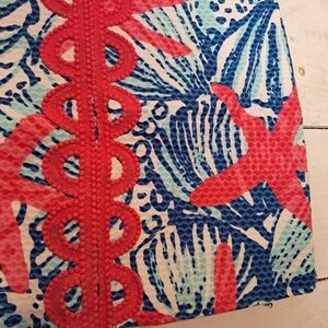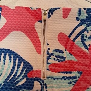A stylish Lilly Pulitzer mini skirt featuring a sea shell pattern, crafted from cotton with a colorful starfish design. This Size 0 skirt has a zip closure and is lined for comfort. It is embellished with embroidered accents, making it perfect for a summer or spring wardrobe.